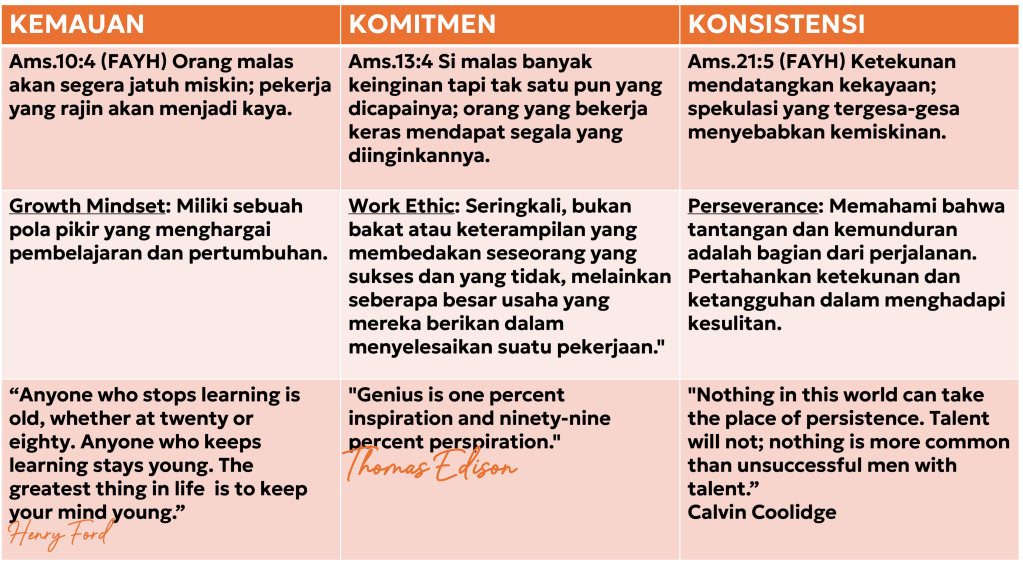 Pada akhirnya kita menyadari bahwa karier yang baik, penghasilan yang besar atau usaha yang berhasil, adalah BONUS, TUJUAN dari pekerjaan adalah untuk menghormati Tuhan, melayani Tuhan dan melayani orang-orang lain.